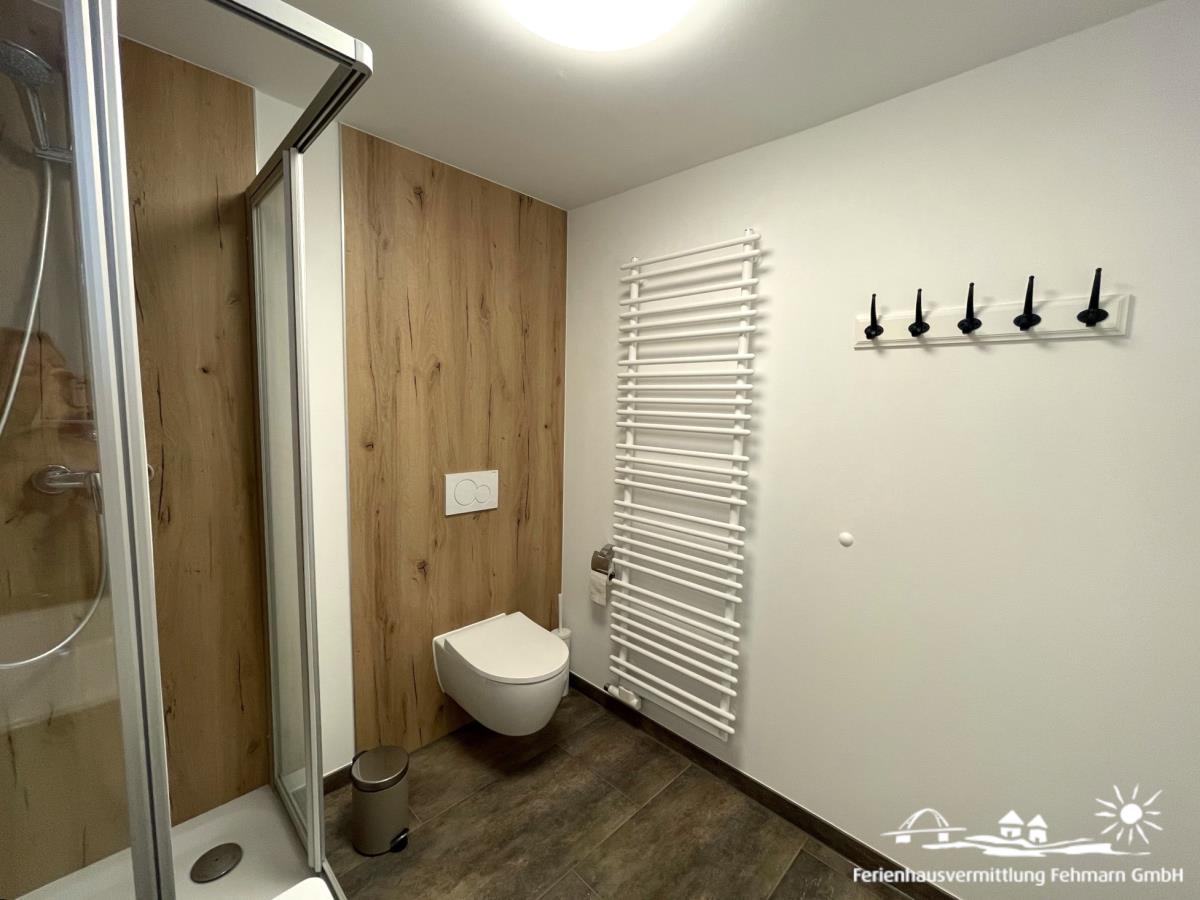 Das moderne Badezimmer mit Dusche ist komfortabel ausgestattet. Im Badezimmer befindet sich außerdem noch ein Handtuchheizkörper und ein Fön.